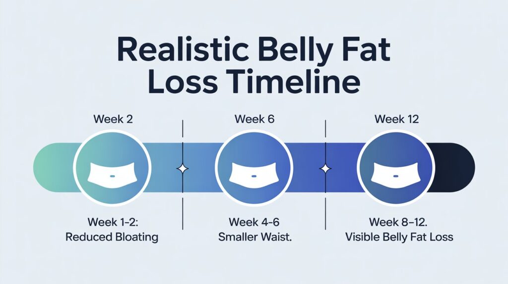 Most people notice reduced bloating within 2–3 weeks, a smaller waist in 4–6 weeks, and visible belly fat loss within 8–12 weeks when following consistent natural habits.